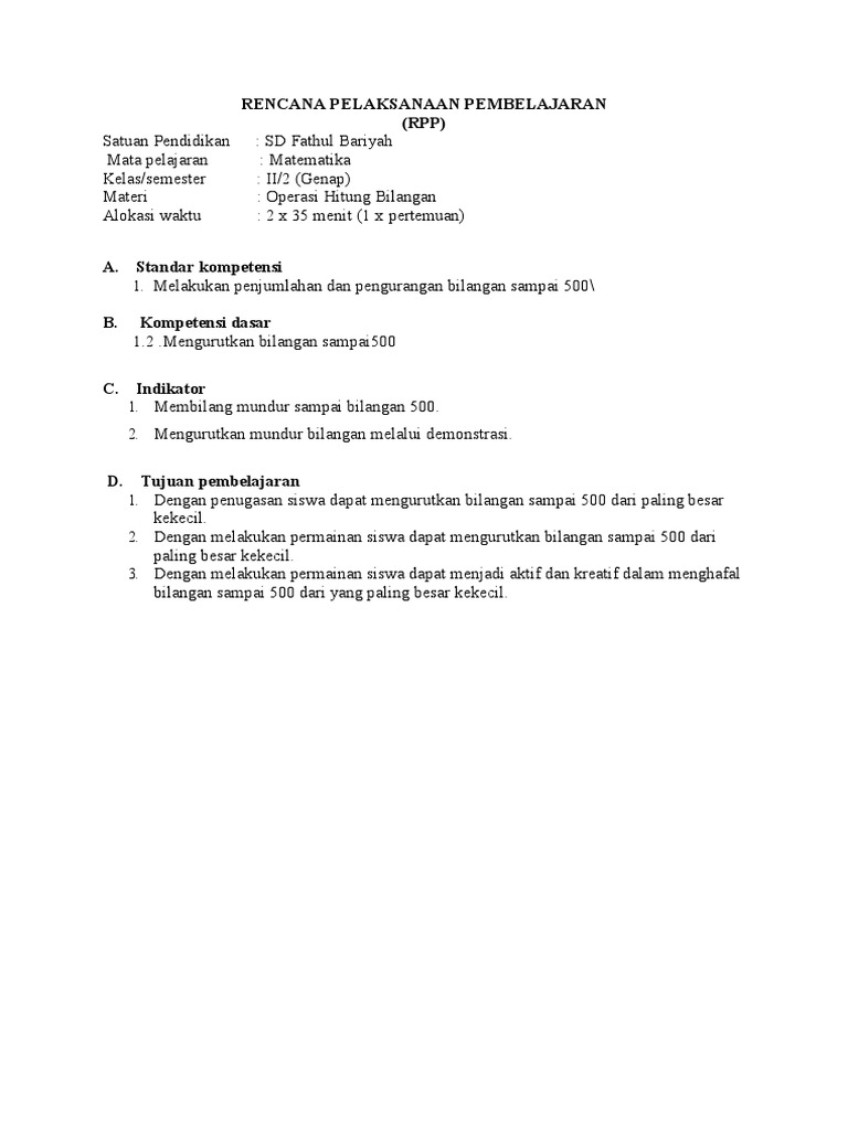 1. Dengan penugasan siswa dapat mengurutkan bilangan sampai 500 dari paling besar