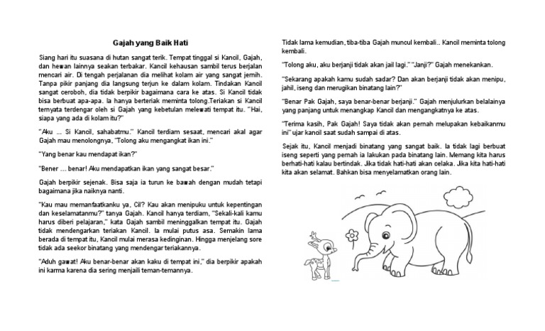 bisa berbuat apa-apa. Ia hanya berteriak meminta tolong.Teriakan si Kancil “Benar Pak Gajah, saya benar-benar berjanji.’’ Gajah menjulurkan belalainya