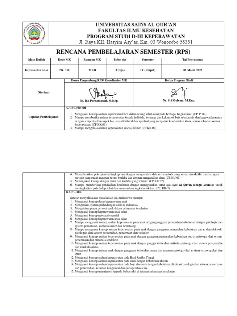 Mata kuliah ini menguraikan tentang konsep dan teori serta praktek/aplikasi asuhan keperawatan anak pada rentang sehat dan