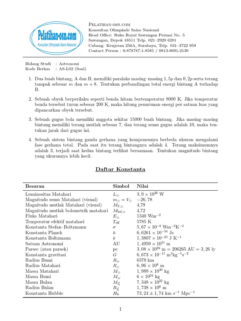 1. Dua buah bintang, A dan B, memiliki paralaks masing–masing 1, 5p dan 0, 2p serta terang