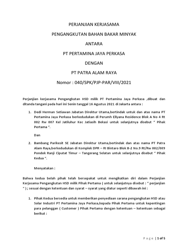 Perjanjian kerjasama Pengangkutan HSD milik PT Pertamina Jaya Perkasa ,dibuat dan