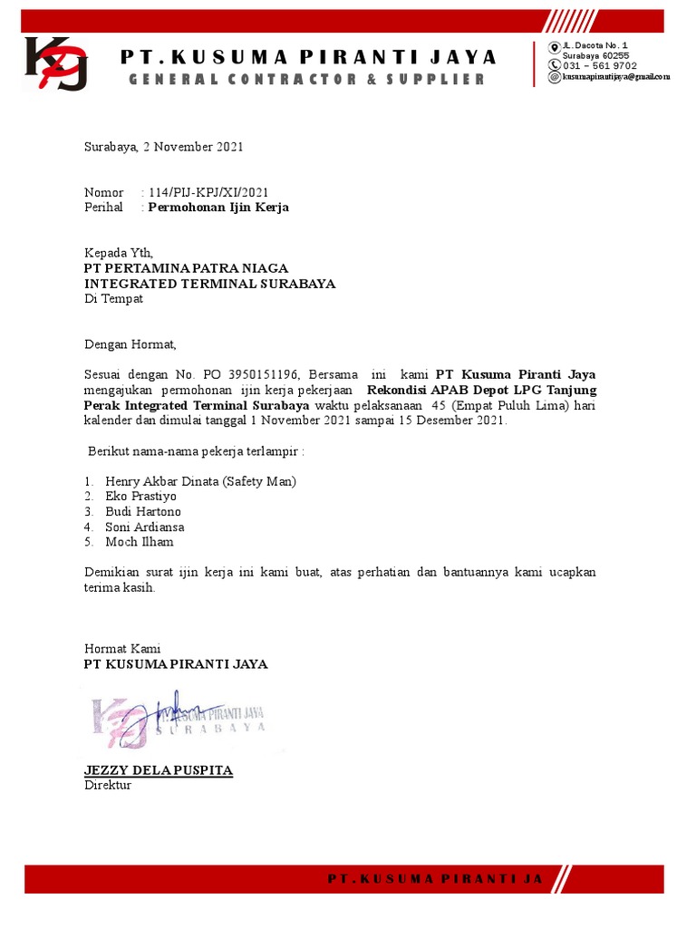 Surabaya, bersama ini kami dari PT. KUSUMA PIRANTI JAYA mengajukan Permohonan