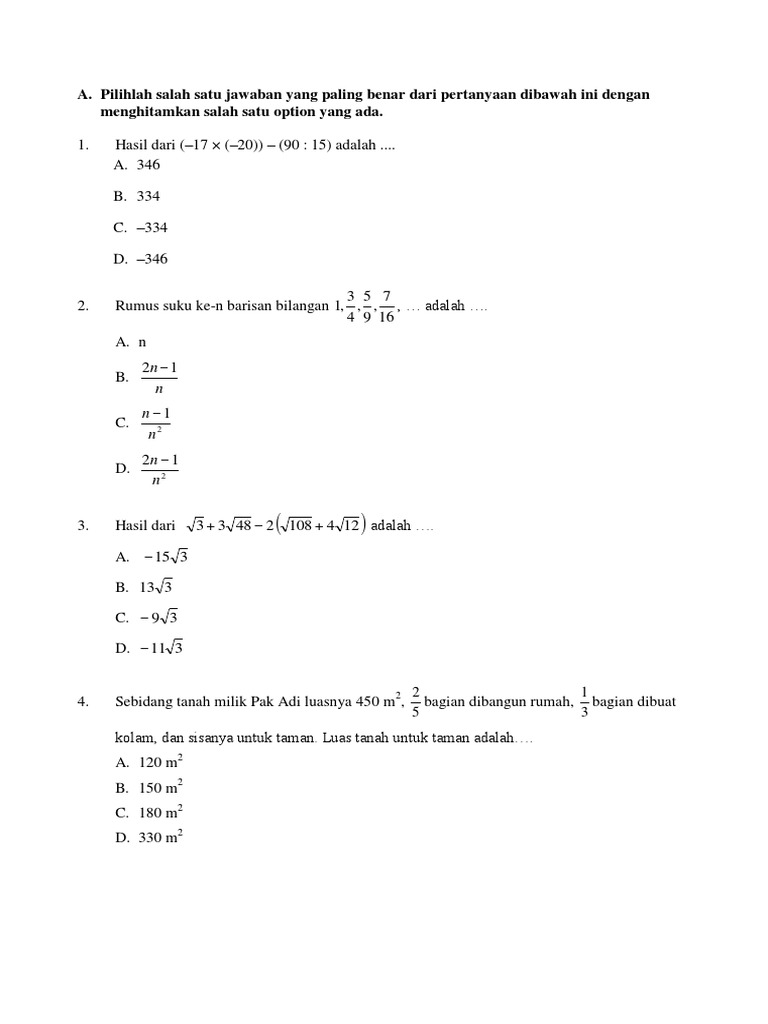 1. Hasil dari (–17 × (–20)) – (90 : 15) adalah ....