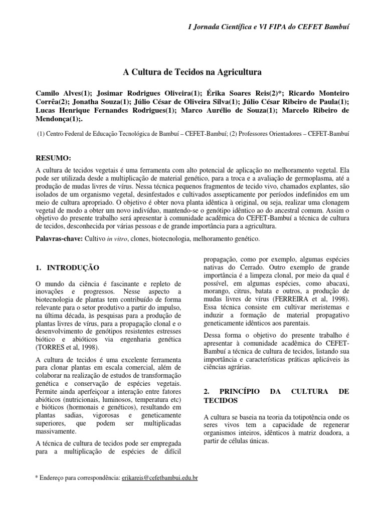 Dessa forma o objetivo do presente trabalho é apresentar à comunidade acadêmica do CEFET- Bambuí a técnica de cultura de tecidos, listando sua importância e características práticas aplicáveis às ciências agrárias.