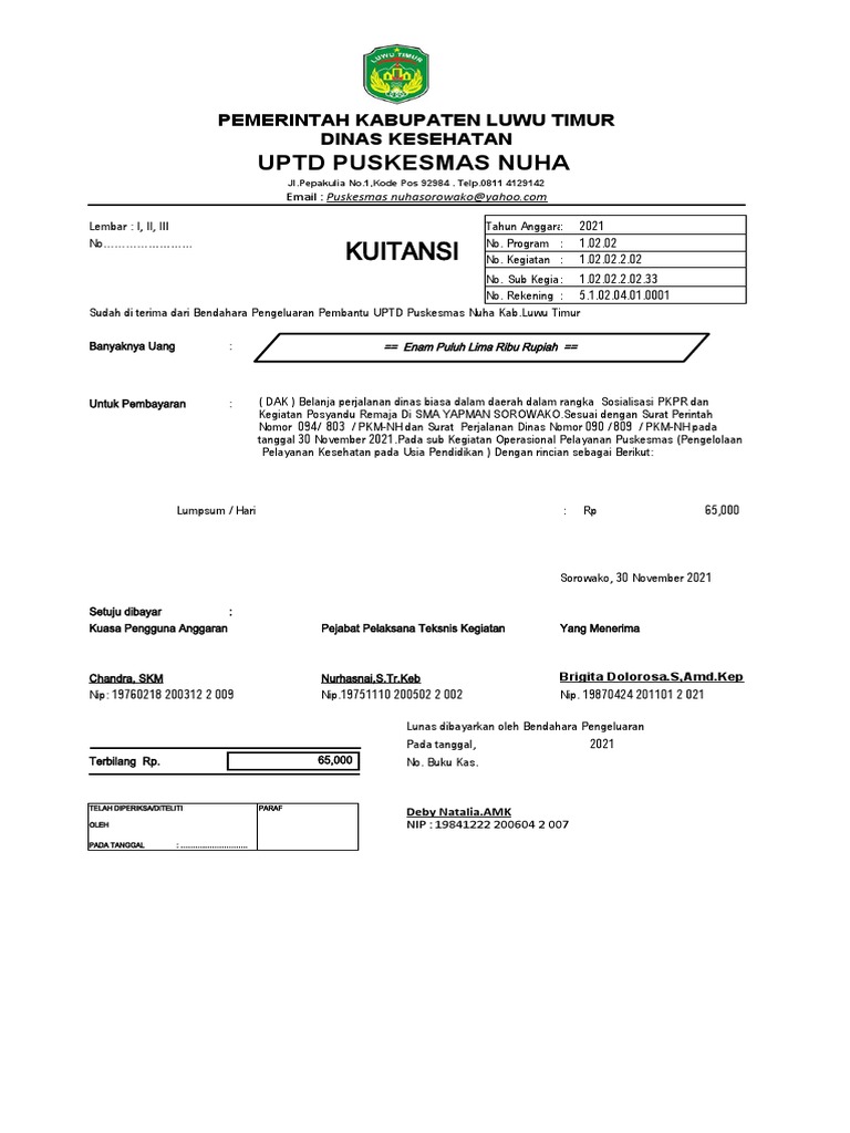 Sudah di terima dari Bendahara Pengeluaran Pembantu UPTD Puskesmas Nuha Kab.Luwu Timur