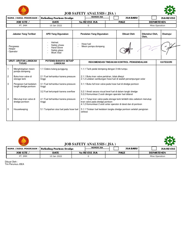 NAMA /JUDUL PEKERJAAN : Refueling Pontoon Dredge JSA BARU JSA REVISI