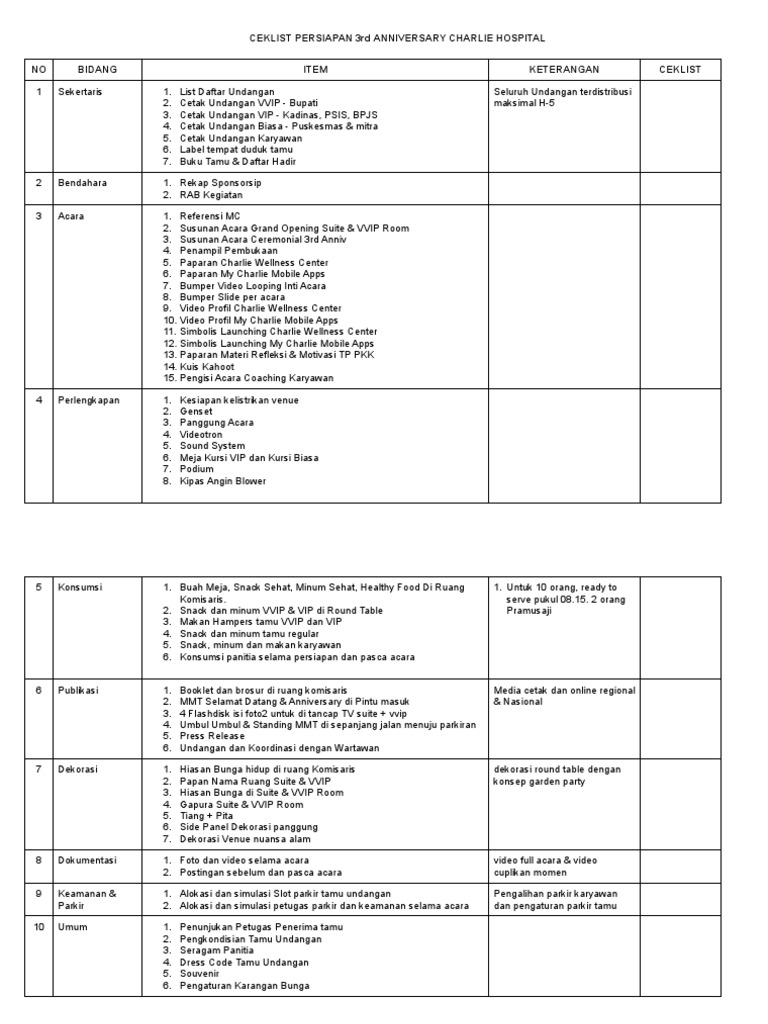 CEKLIST PERSIAPAN 3rd ANNIVERSARY CHARLIE HOSPITAL