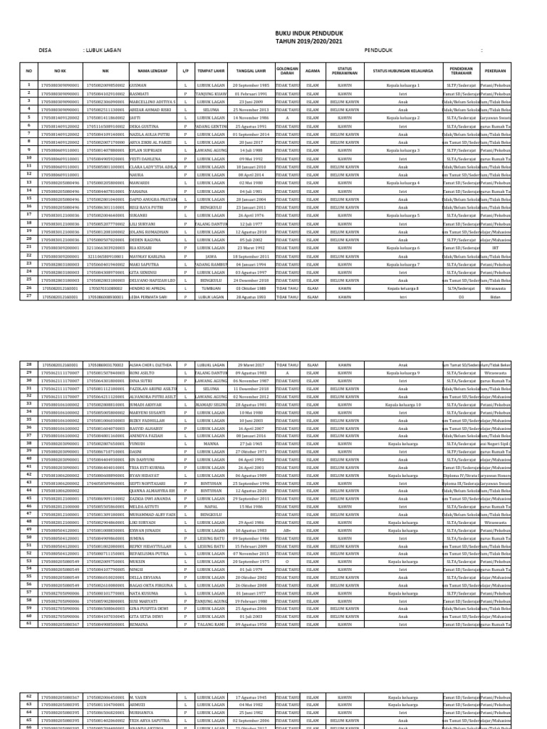73 1705081511110003 1705085705740001 NIKUSUMA WATI P LUBUK LAGAN 17 Mei 1974 TIDAK TAHU ISLAM KAWIN Istri SLTA/Sederajat Wiraswasta
