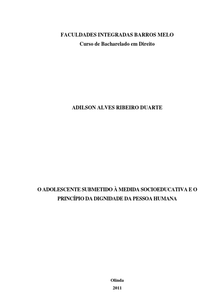 9 possibilidade de um enriquecimento fcil e sem causa, como a devoluo de dinheiro ou bens que tenha encontrado. Isso o mnimo que se espera de uma pessoa digna. Assim sendo, haver adultos que tenham valores inconsistentes e que os projetem sobre as geraes posteriores, relativizando o conceito de dignidade; haver no seio familiar uma noo muito pobre, quando h, de dignidade; haver na tutela do Estado sobre menores uma consistente negativa dignidade dos mesmos, a despeito dos preceitos normativos que deveriam comandar o trato entre os agentes do Estado e os tutelados; enfim, haver quem negue direta ou veladamente a condio de ser humano a uma criana ou adolescente, provoca a necessidade de se burilar o assunto, a fim de se ter algum elemento com que se possa contraargumentar com a sociedade em todas as suas esferas, para da tirar algo que recaia sobre as crianas e adolescentes como um manto de respeito. A produo deste trabalho se deu a partir da pesquisa de bibliografias em torno do tema e de decises judiciais, em particular as da 3 Vara da Infncia e Juventude do Recife. A pesquisa bibliogrfica foi focada nos escritos sobre a relao da criana e o adolescente com o Estado, com a sociedade e com seu meio, sua autopercepo enquanto ser social e a abordagem multivariada do tema e sobre o Estatuto da Criana e do Adolescente. A pesquisa documental cumpriu etapas previamente estabelecidas e necessrias legitimidade da mesma. Nesse sentido, foi feito contato prvio com a 3 Vara da Infncia e Juventude do Recife, seguido de solicitao formal de acesso aos autos acompanhada de Termo de Responsabilidade e Confiabilidade, os quais foram submetido apreciao do Ministrio Pblico, o qual no se ops, culminando com a autorizao do Juzo e o apoio dos serventurios da justia. Aps o cumprimento dessas etapas prvias, procuramos focar nossa pesquisa, subsidiada por formulrio prprio, em processos cujos resultados fossem pela aplicao de medidas socioeducativa de semiliberdade e internao, permitindo-nos apreciar processos outros que, por suas caractersticas, nos fornecessem elementos passveis de serem apreciados.