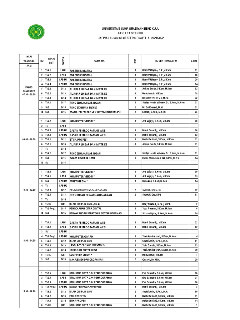 09.00 - 10.30 5 TI/PK LAB H GERAKAN MUHAMMADIYAH (AIK 3) 2 Dedy Novriadi, S.Pd.I, M.Pd.I/ 5