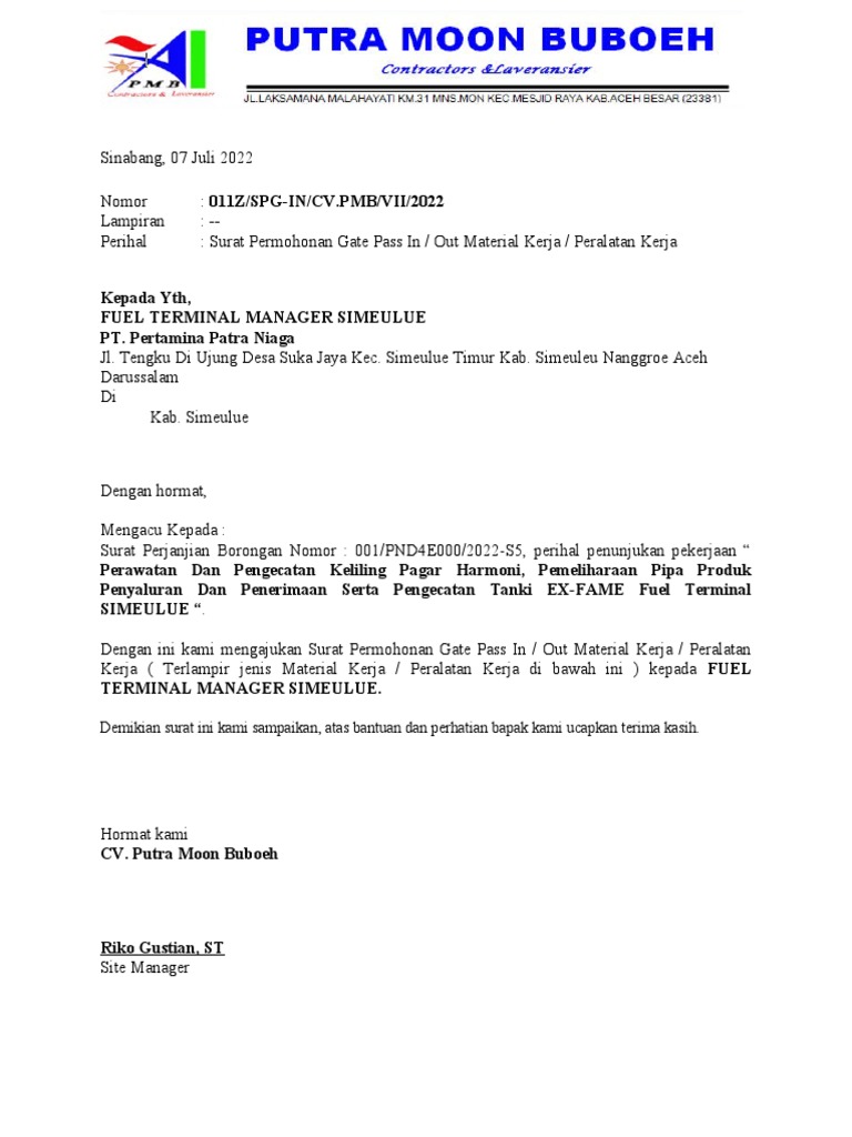 Dengan ini kami mengajukan Surat Permohonan Gate Pass In / Out Material Kerja / Peralatan