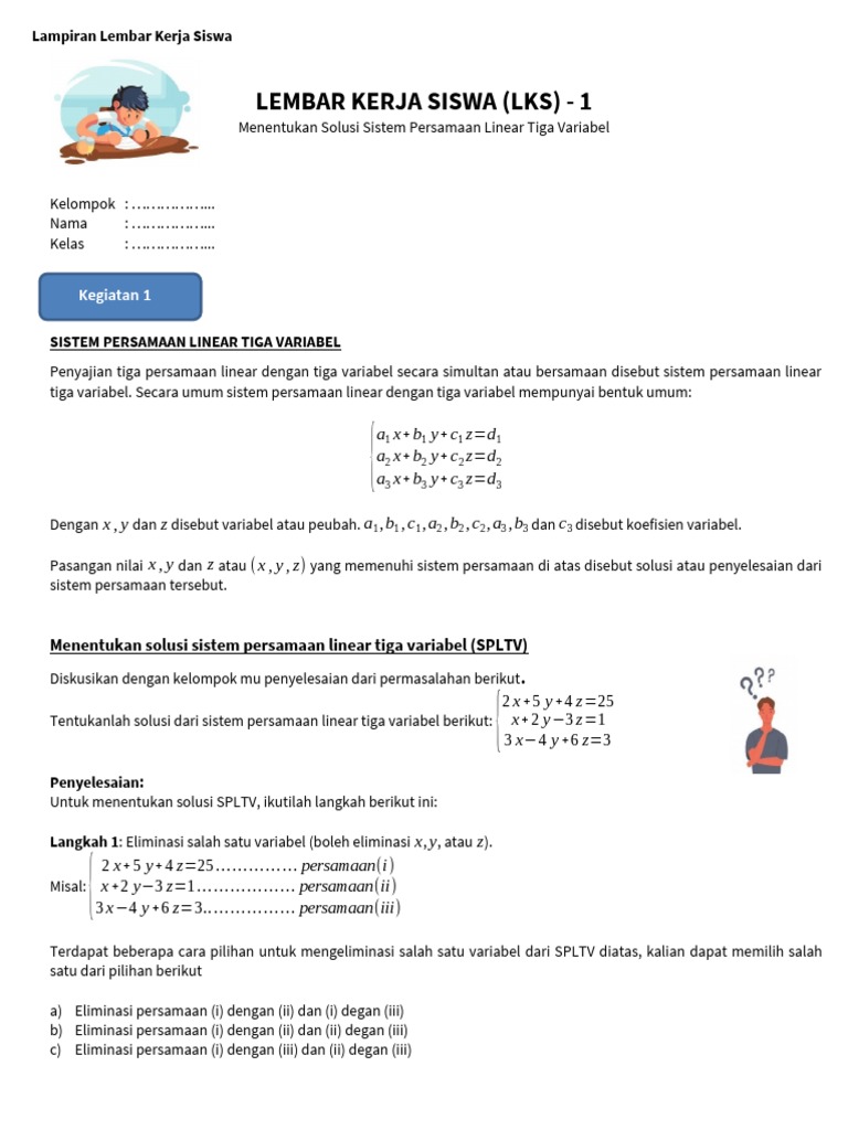 a. Apakah yang dimaksud dengan solusi dari sistem persamaan linear tiga variabel?