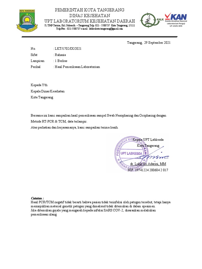 Hasil Uji Laboratorium COVID-19 Tangerang