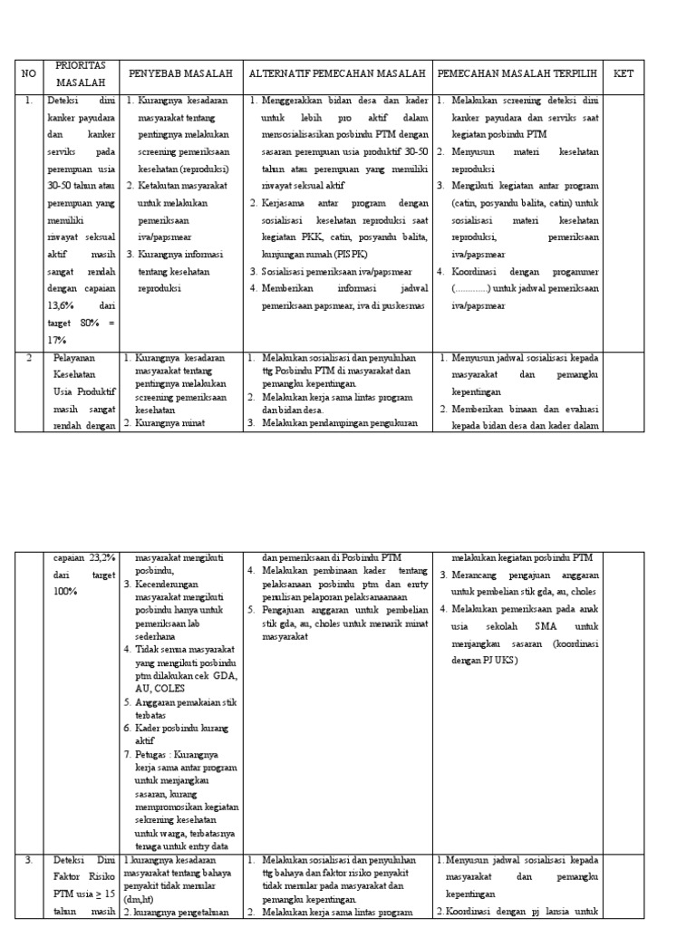 1. Deteksi dini 1. Kurangnya kesadaran 1. Menggerakkan bidan desa dan kader 1. Melakukan screening deteksi dini