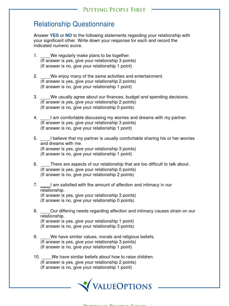 Answer YES or NO to the following statements regarding your relationship with your significant other. Write down your response for each and record the indicated numeric score. 1. ____We regularly make plans to be together. (If answer is yes, give your relationship 3 points) (If answer is no, give your relationship 1 point) 2. ____We enjoy many of the same activities and entertainment. (If answer is yes, give your relationship 2 points) (If answer is no, give your relationship 1 point) 3. ____We usually agree about our finances, budget and spending decisions. (If answer is yes, give your relationship 2 points) (If answer is no, give your relationship 0 points) 4. ____I am comfortable discussing my worries and dreams with my partner. (If answer is yes, give your relationship 3 points) (If answer is no, give your relationship 1 point) 5. ____I believe that my partner is usually comfortable sharing his or her worries and dreams with me. (If answer is yes, give your relationship 3 points) (If answer is no, give your relationship 1 point) 6. ____There are aspects of our relationship that are too difficult to talk about. (If answer is yes, give your relationship 0 points) (If answer is no, give your relationship 2 points) 7. ____I am satisfied with the amount of affection and intimacy in our relationship. (If answer is yes, give your relationship 3 points) (If answer is no, give your relationship 0 points) 8. ____Our differing needs regarding affection and intimacy causes strain on our relationship. (If answer is yes, give your relationship 1 point) (If answer is no, give your relationship 3 points) 9. ____We have similar values, morals and religious beliefs. (If answer is yes, give your relationship 3 points) (If answer is no, give your relationship 1 point) 10. ____We have similar beliefs about how to raise children. (If answer is yes, give your relationship 2 points) (If answer is no, give your relationship 1 point)