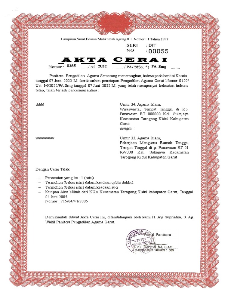 Demikianlah dibuat Akta Cerai ini, ditandatangani oleh kami H. Ayi Supriatna, S. Ag