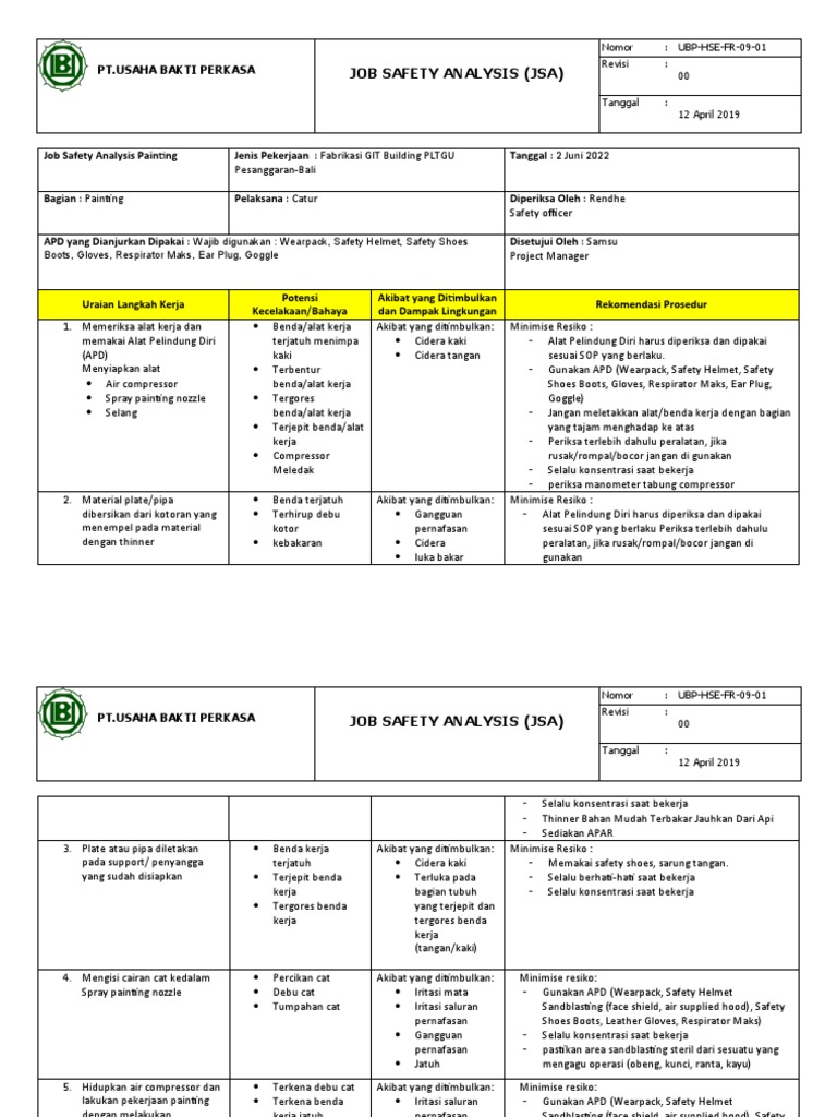 Job Safety Analysis Painting Jenis Pekerjaan : Fabrikasi GIT Building PLTGU Tanggal : 2 Juni 2022