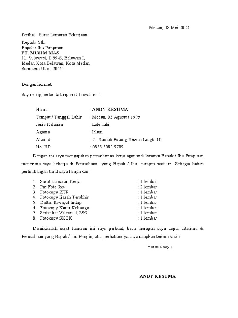 lulusan SMK TR Sinar Husni, bermaksud untuk mengajukan lamaran kerja ke PT. Musim