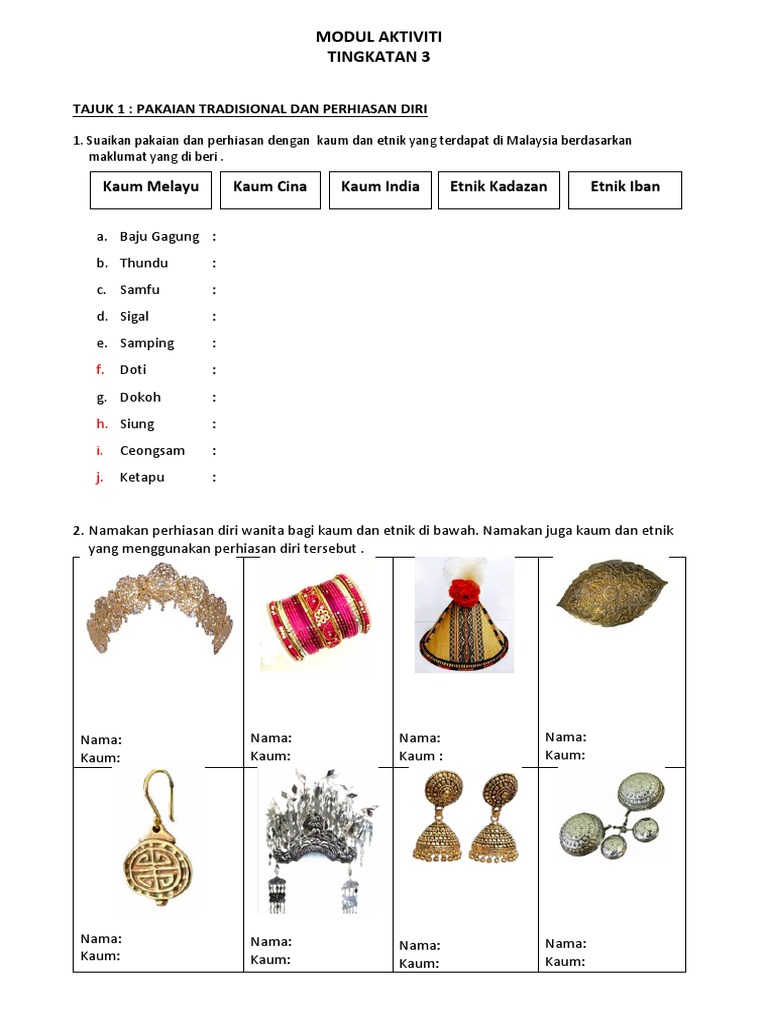 1. Suaikan pakaian dan perhiasan dengan kaum dan etnik yang terdapat di Malaysia berdasarkan