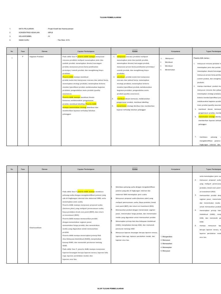 Pada akhir fase F peserta didik mampu menyusun rencana produksi meliputi menetapkan jenis dan jumlah produk, menetapkan desain/rancangan produk, menyusun proses kerja pembuatan pro