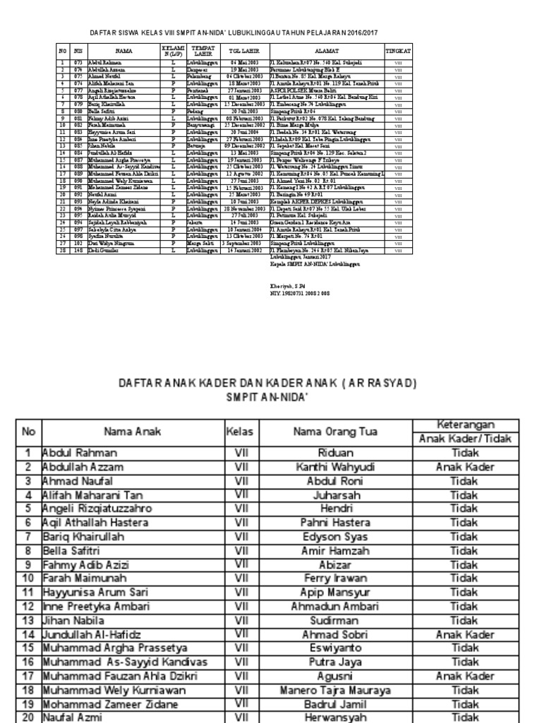 DAFTAR SISWA KELAS VIII SMPIT AN-NIDA' LUBUKLINGGAU TAHUN PELAJARAN 2016/2017