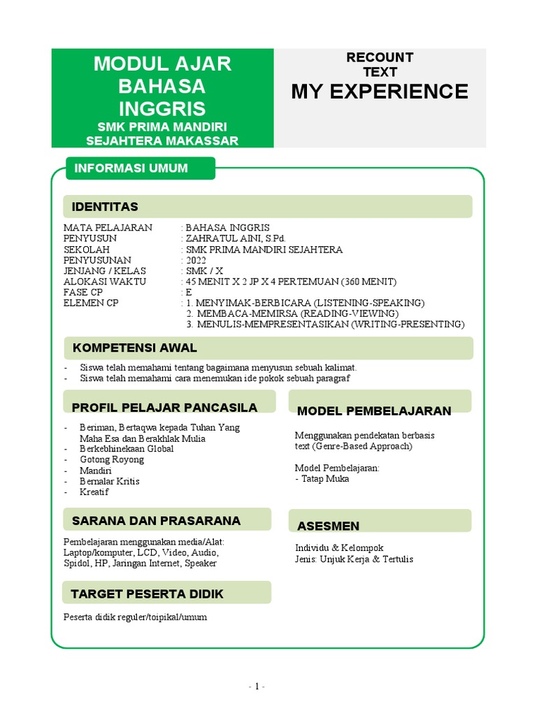 Tujuan : Peserta didik mampu menyusun recount text lisan dengan bahasa sendiri sesuai