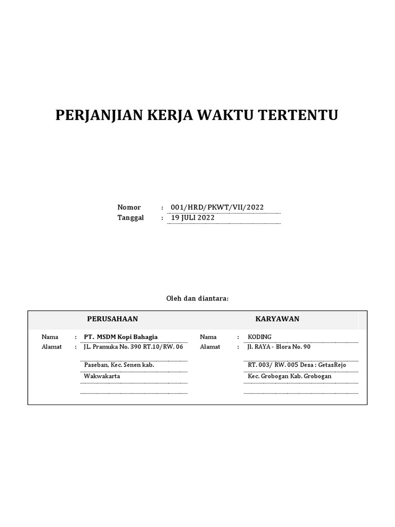 PERJANJIAN KERJA WAKTU TERTENTU Nomor: 001/HRD/PKWT/VII/2022 ini