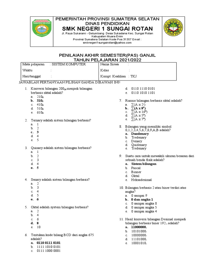 Mata pelajaran : SISTEM KOMPUTER Nama Siswa :