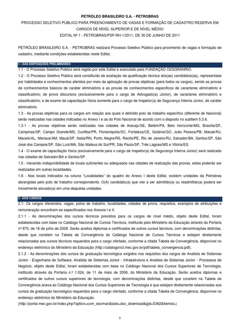 - PETROBRAS PROCESSO SELETIVO PBLICO PARA PREENCHIMENTO DE VAGAS E FORMAO DE CADASTRO RESERVA EM CARGOS DE NVEL SUPERIOR E DE NVEL MDIO EDITAL N 1 - PETROBRAS/PSP-RH-1/2011, DE 30 DE JUNHO DE 2011