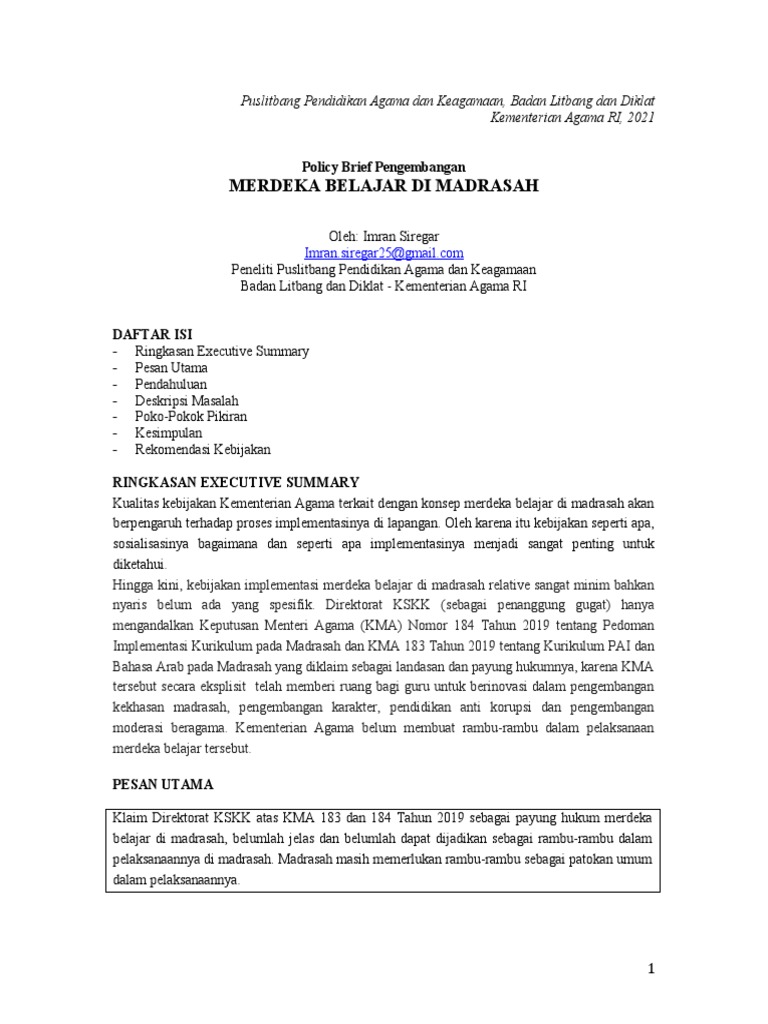 Hingga kini, kebijakan implementasi merdeka belajar di madrasah relative sangat minim bahkan