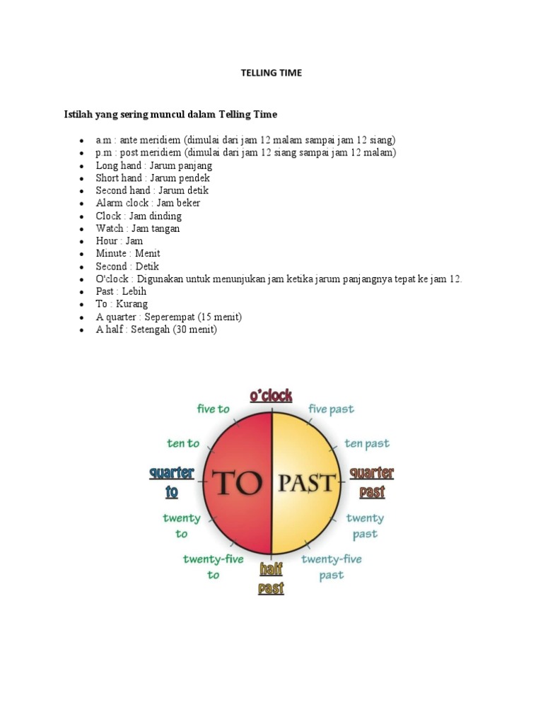 'past' atau 'to' untuk menerangkan kurang atau lebihnya menit pada jam tersebut.