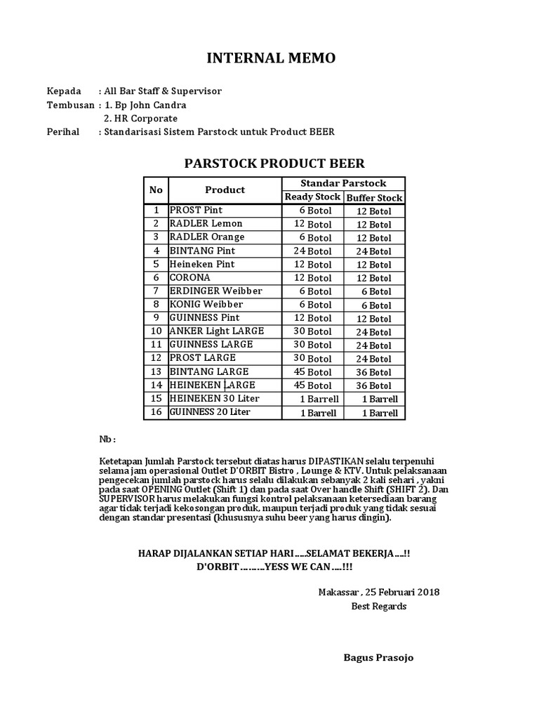 Perihal : Standarisasi Sistem Parstock untuk Product BEER
