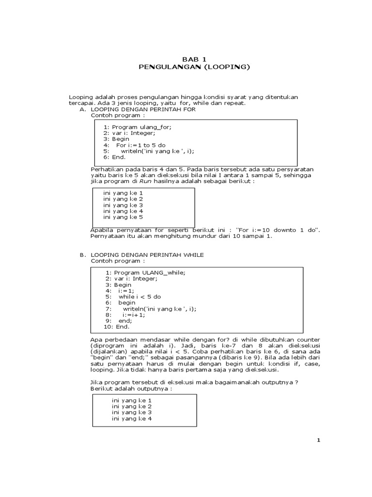 tercapai. Ada 3 jenis looping, yaitu for, while dan repeat.