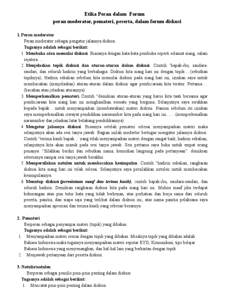 peran moderator, pemateri, peserta, dalam forum diskusi