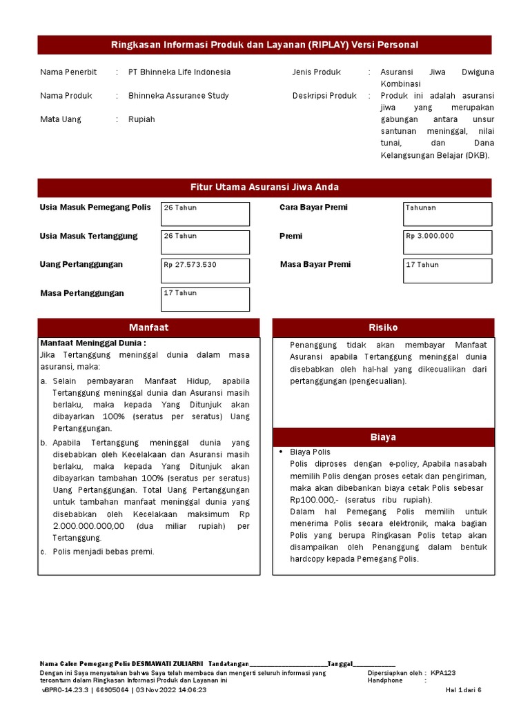 Jenis Kelamin Pemegang Polis : Perempuan Masa Asuransi : 17 Tahun