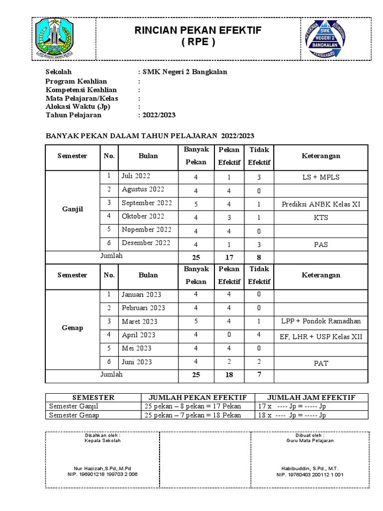 A. Semester Gasal : 17 pekan x --- Jam Tatap Muka = ---- Jam pelajaran