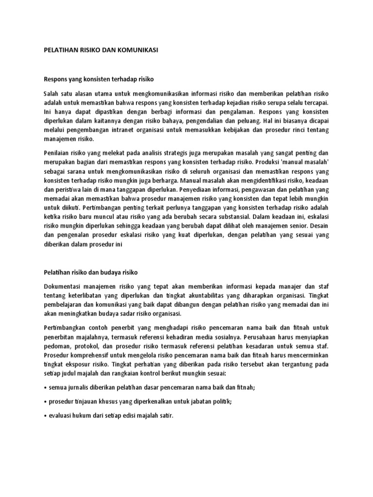 pelatihan risiko. Pengaturan komunikasi merupakan bagian dari budaya risiko. Komunikasi risiko