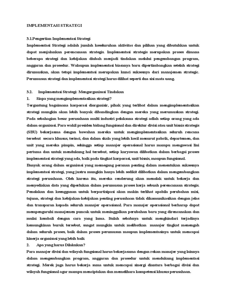 Implementasi Strategi adalah jumlah keseluruhan aktivitas dan pilihan yang dibutuhkan untuk