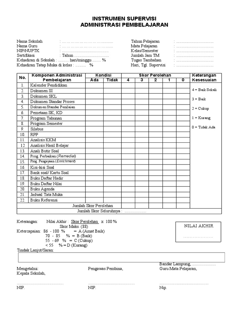Keterangan: Nilai Akhir : Skor Perolehan x 100 %