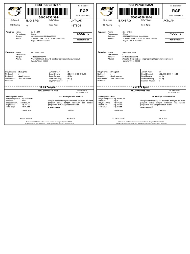 RESI PENGIRIMAN No BJG-33109 RESI PENGIRIMAN No BJG-33109