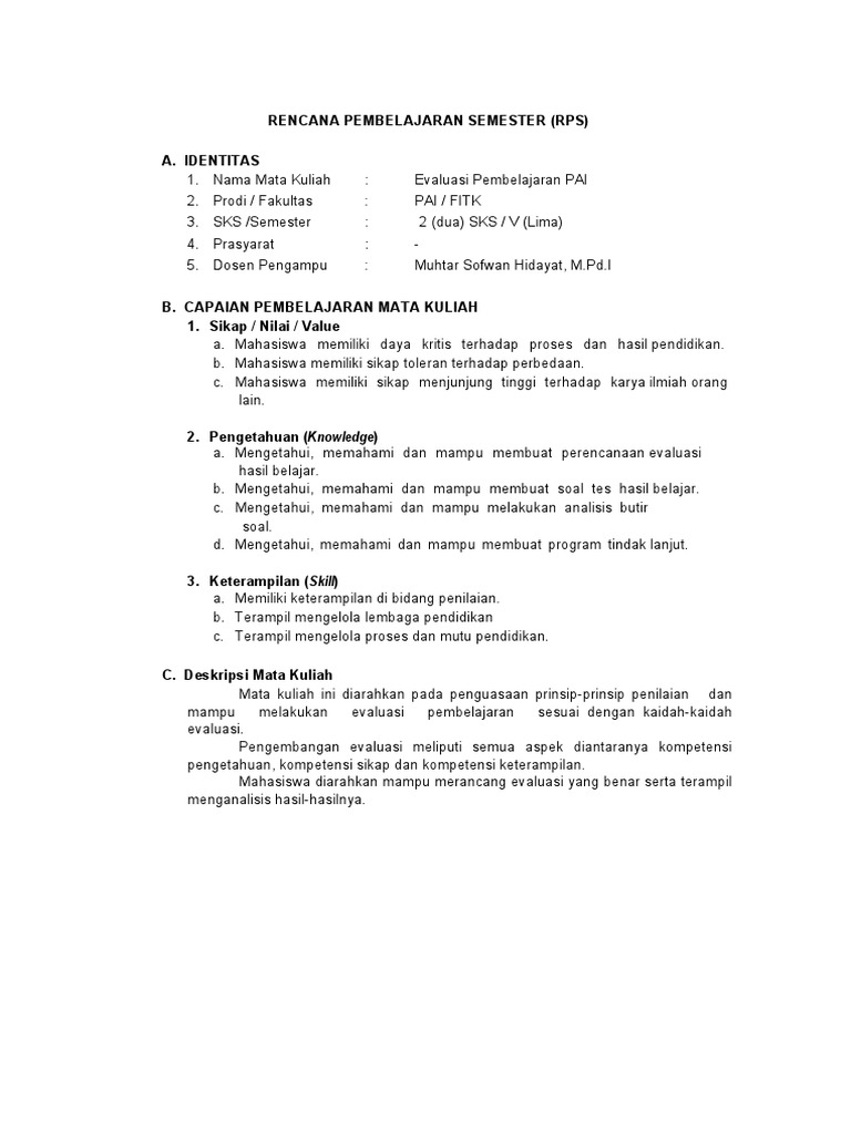 1. Nama Mata Kuliah : Evaluasi Pembelajaran PAI
