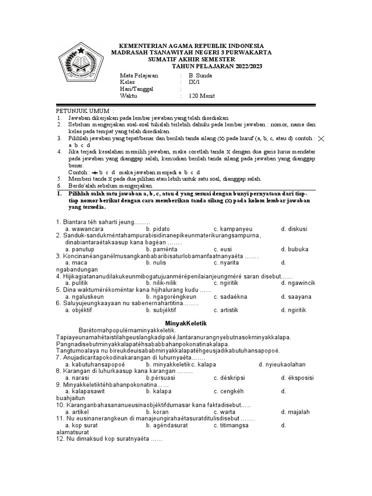 3. Pilihlah jawaban yang tepat/benar dan berilah tanda silang (X) pada huruf (a, b, c, atau d) contoh :