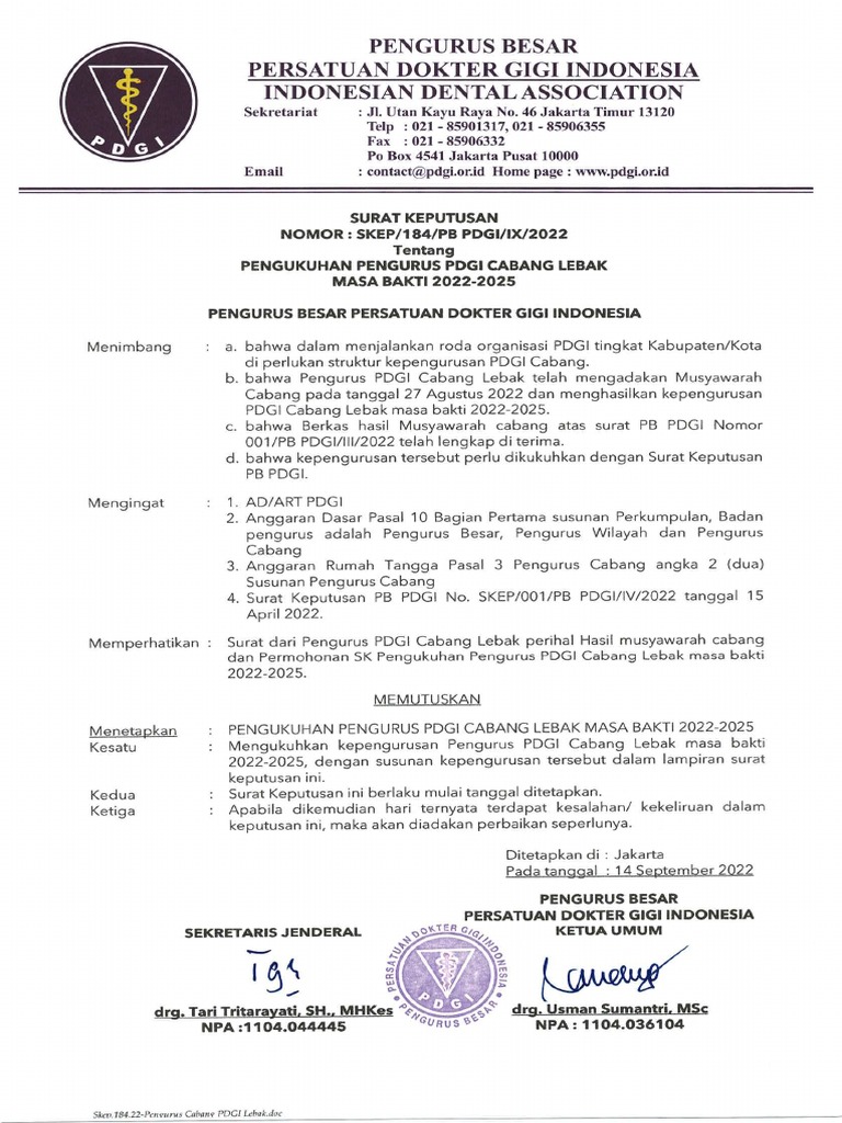 NOMOR : SKEP/184/PB PDGI/IX/2022