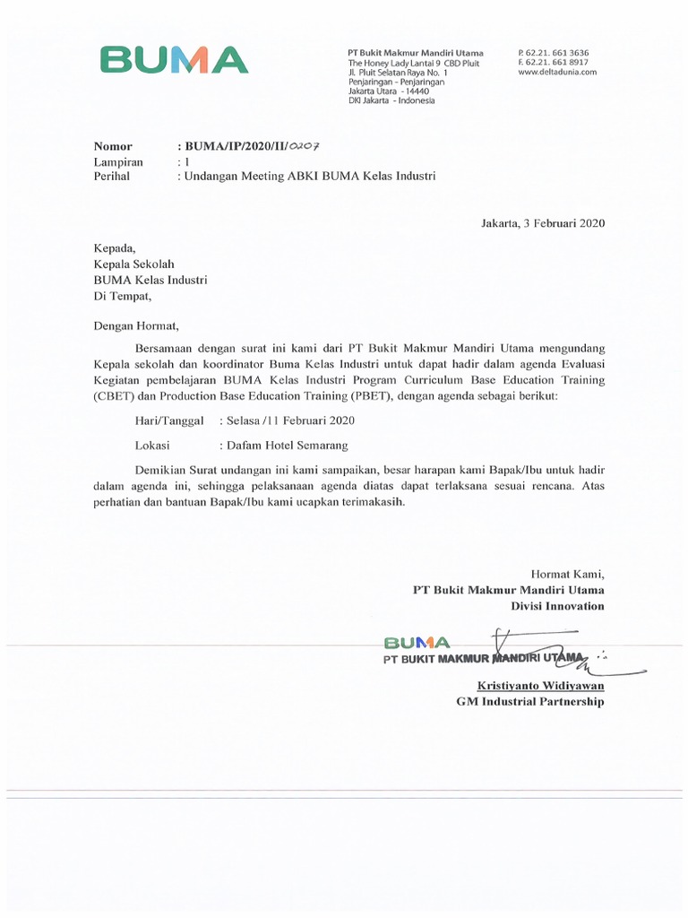 Bersamaan dengan surat ini kami dari PT Bukit Makmur Mandiri Utama mengundang