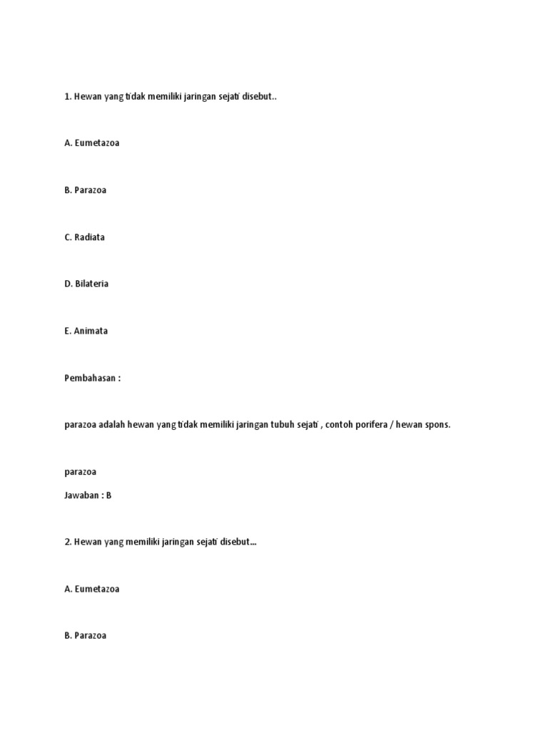 1. Hewan yang tidak memiliki jaringan sejati disebut..