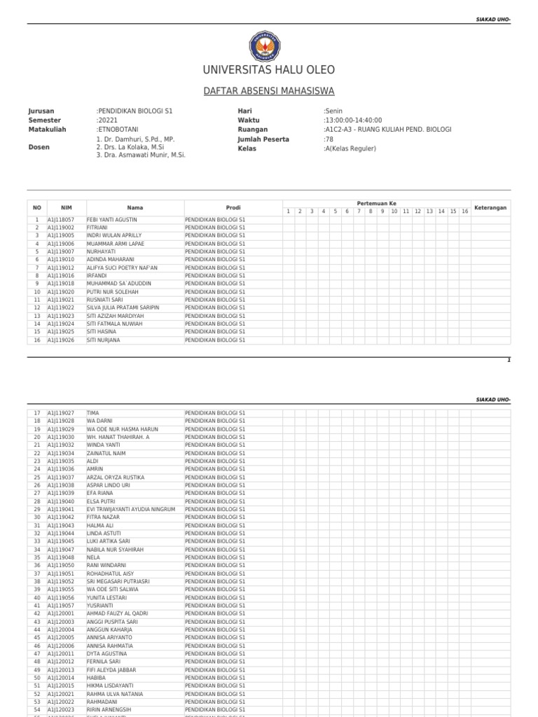 Matakuliah :ETNOBOTANI Ruangan :A1C2-A3 - RUANG KULIAH PEND. BIOLOGI