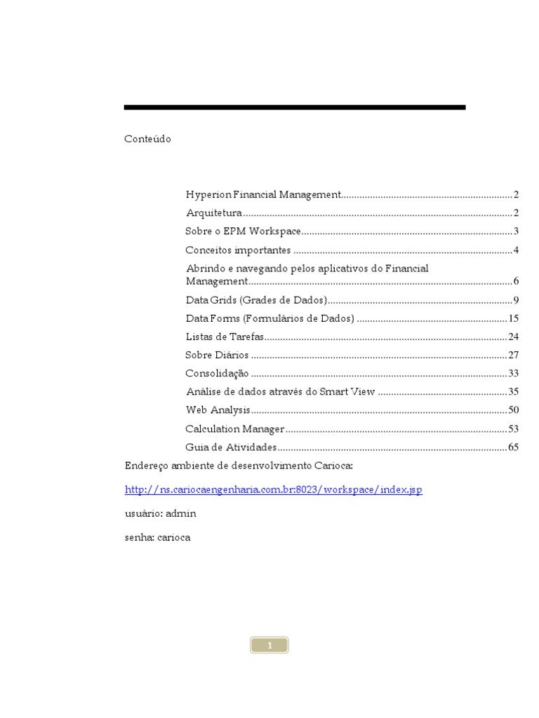 Hyperion Financial Management................................................................. 2 Arquitetura ...................................................................................................... 2 Sobre o EPM Workspace................................................................................ 3 Conceitos importantes ................................................................................... 4 Abrindo e navegando pelos aplicativos do Financial Management .................................................................................................... 6 Data Grids (Grades de Dados) ...................................................................... 9 Data Forms (Formulrios de Dados) ......................................................... 15 Listas de Tarefas............................................................................................ 24 Sobre Dirios ................................................................................................. 27 Consolidao ................................................................................................. 33 Anlise de dados atravs do Smart View ................................................. 35 Web Analysis ................................................................................................. 50 Calculation Manager .................................................................................... 53 Guia de Atividades ....................................................................................... 65 Endereo ambiente de desenvolvimento Carioca: http://ns.cariocaengenharia.com.br:8023/workspace/index.jsp usurio: admin senha: carioca
