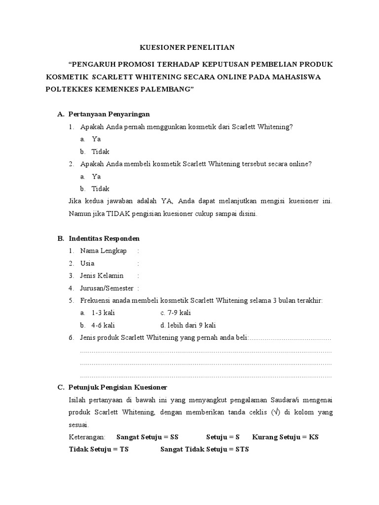 produk Scarlett Whitening, dengan memberikan tanda ceklis (√) di kolom yang