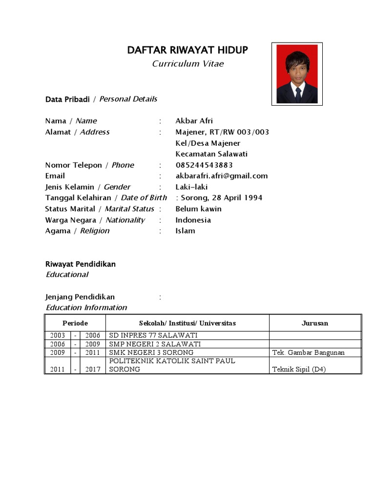 Tanggal Kelahiran / Date of Birth : Sorong, 28 April 1994