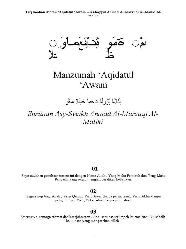 Terjemahan Matan ‘Aqidatul ‘Awam – As-Sayyid Ahmad Al-Marzuqi Al-Maliki Al-